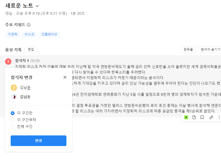• 새로운 노트를 만들었고요. 1분 20초 녹음을 진행했습니다.