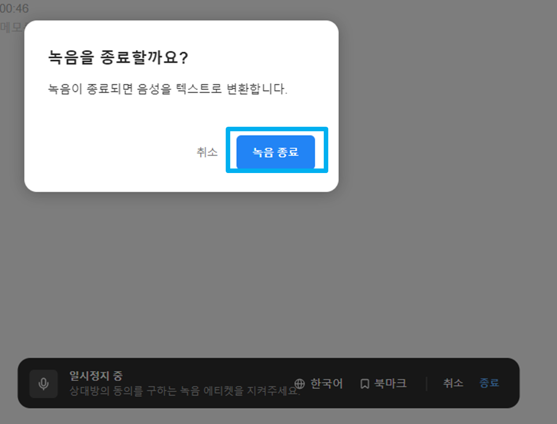 - 팝업이 뜨고 확인을 클릭하시면 녹음이 종료됩니다.