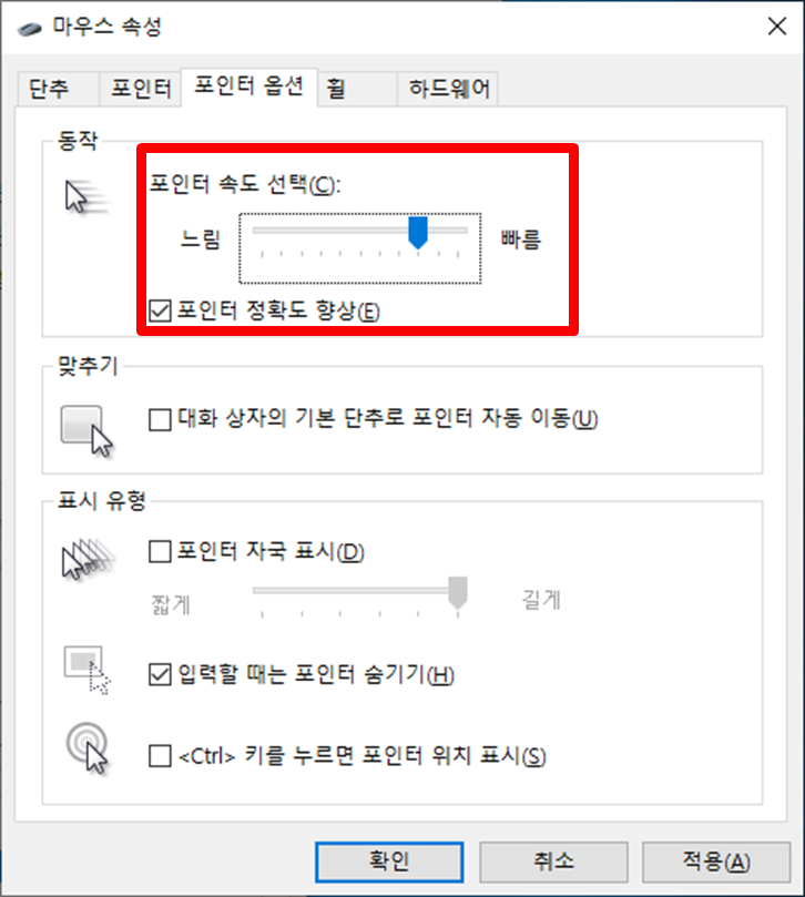 마우스 설정에서 가장 중요한 포인터 옵션입니다.