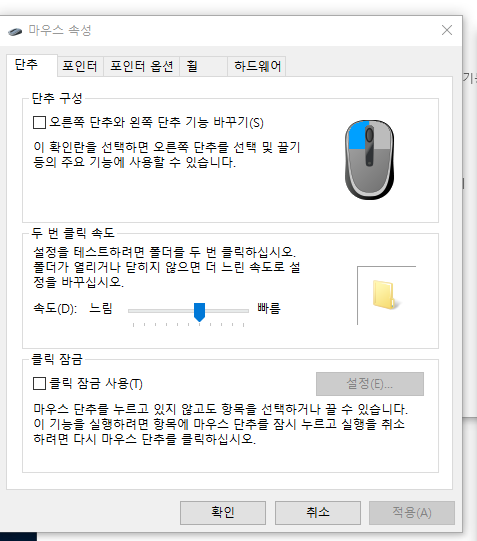 두 번 클릭 속도는 오른쪽 약간 마름 쪽으로 두시고 옆에 폴더를 더블클릭해서 감도를 확인하시면 됩니다.