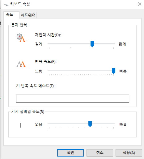 저와 같은 경우는 재입력 시간을 짧게, 반복 속도를 빠름으로 설정하고 사용합니다.
