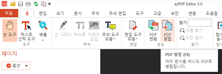 - 상단 아이콘 중에 [홈] 탭에 [PDF 병합]을 클릭합니다.