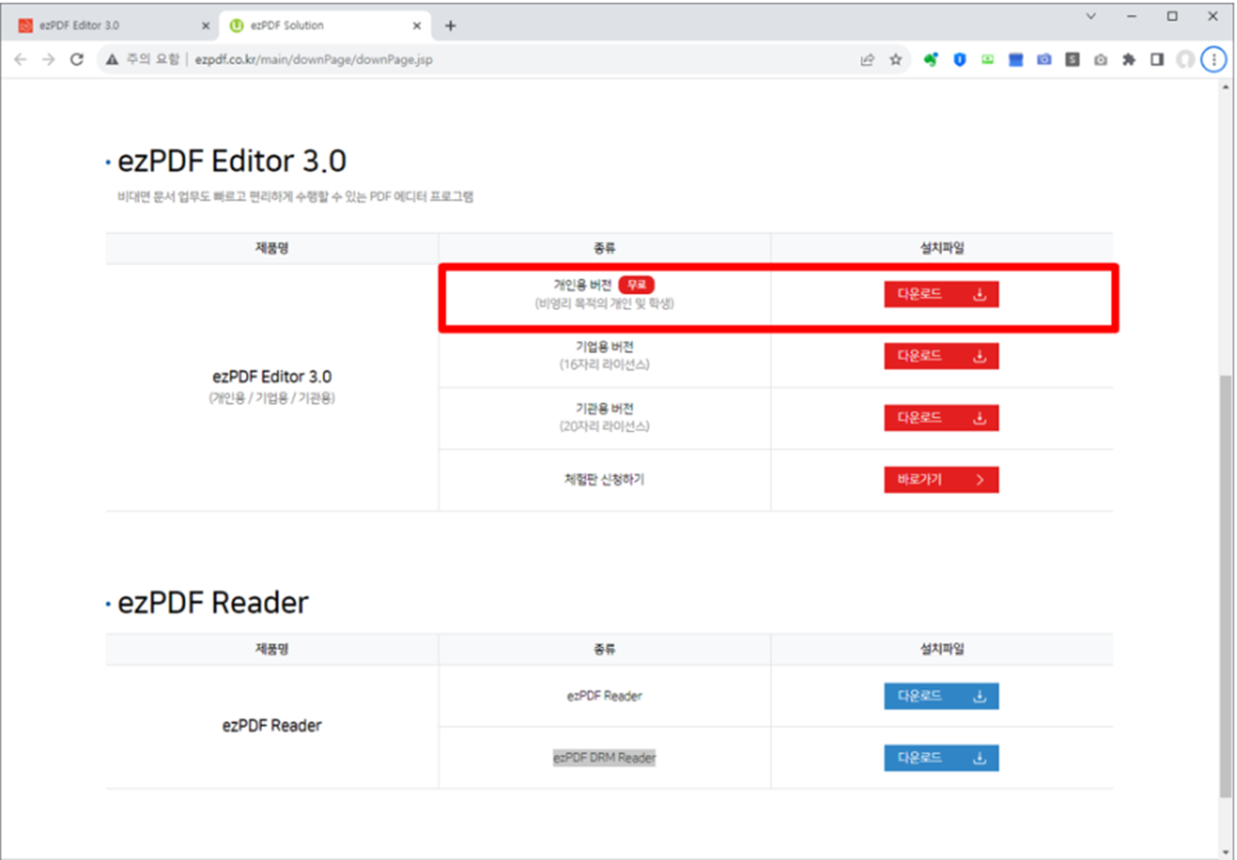 ezPDF Editor 3.0은 개인용 / 기업용 / 기관용으로 각각 다운로드할 수 있으며 ezPDF Reader는 ezPDF Reader, ezPDF DRM Reader 두 가지 버전으로 다운로드가 가능합니다.
