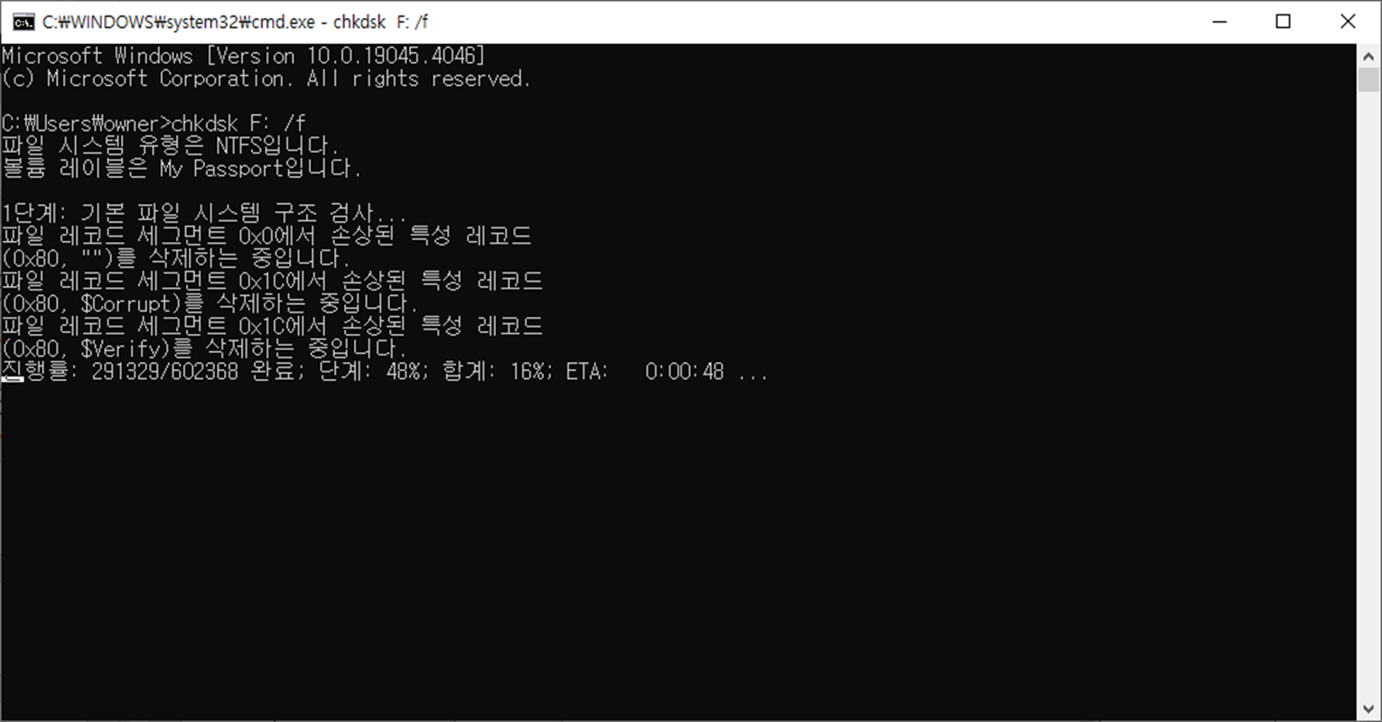 - chkdsk F: /f 라고 입력합니다.