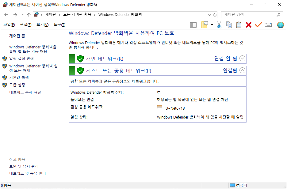 각 네트워크 유형 설정의 사용자 지정에서 윈도우 Defender 방화벽 사용 안 함(권장하지 않음)에 체크한 다음 확인 버튼을 클릭하면 윈도우 방화벽 해제가 설정됩니다.