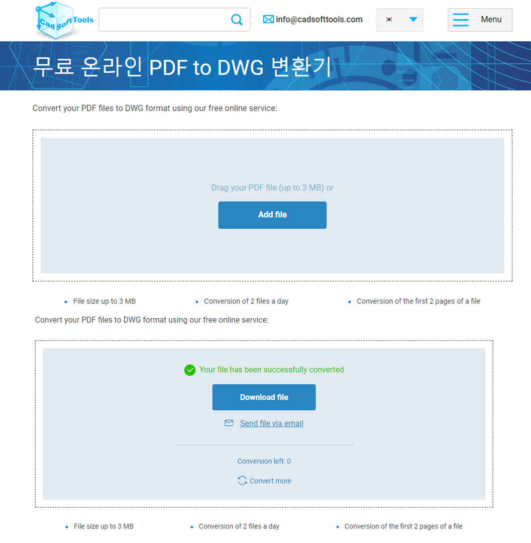 - 하루 2회만 가능하고 업로드 파일 사이즈는 3MB 이내여야 합니다. 만약 더 자주, 큰 파일을 변환하고 싶으시면 유료로 가입하셔야 합니다.
