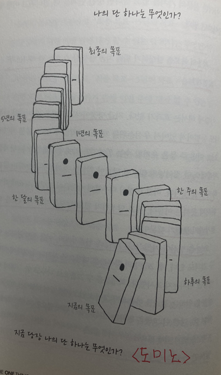 - 자신이 가장 중요하게 생각하는 하나의 일을 지속적으로 수행함으로써 시간이 쌓여 전문가가 되고 세계 최고가 되면 가장 중요한 행복을 맞이할 수 있다.