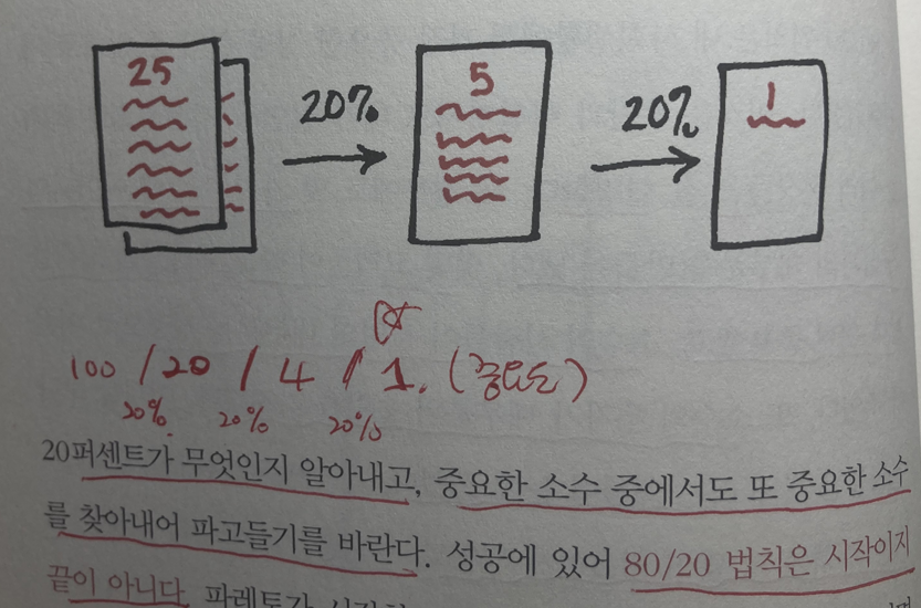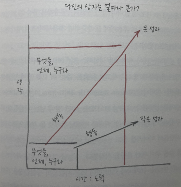 - 성공은 성공의 크기에 비례한다. 모두에게 주어진 시간은 같고, 열심히 일하는 데도 한계가 있다. 업무 시간 동안 무엇을 하느냐가 성과를 결정짓는다.