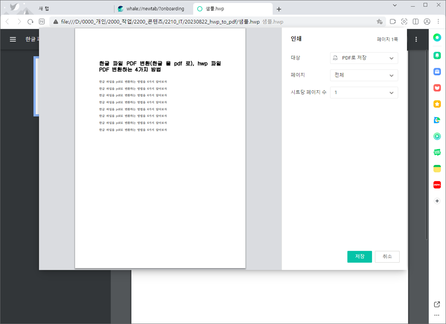 - 웨일 브라우저를 설치하고 한글을 끌어다 놓으면 한글 파일이 보이고, 프린트할 때 프린트 옵션을 pdf로 설정하여 저장하는 방식이며 hwp, hwpx도 가능합니다.
