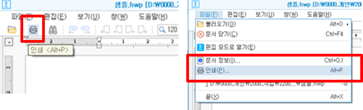 - 화면 상단 메뉴에 보면 프린터 아이콘이나 [파일]-[인쇄]를 클릭합니다.