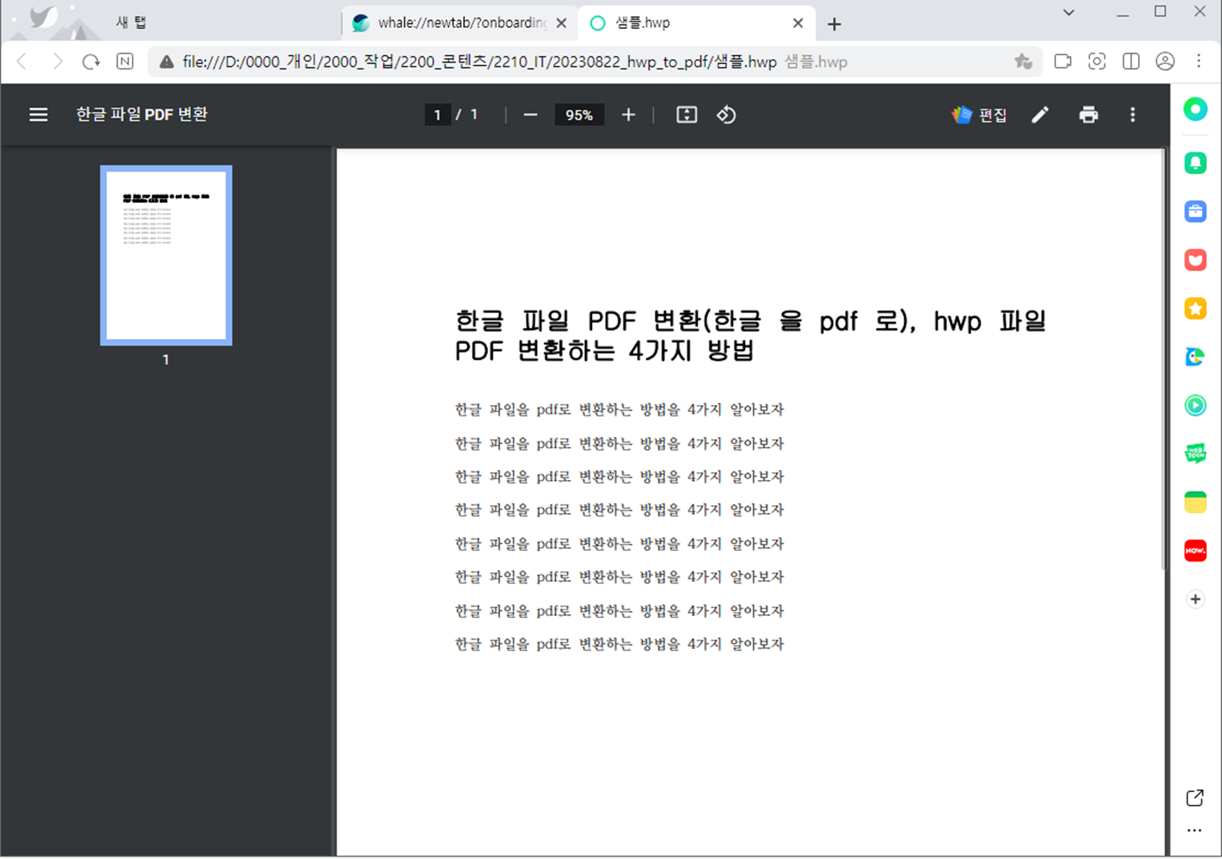 - 한글 파일 내용이 웨일 브라우저에 보이면 파일 업로드가 끝난 겁니다.